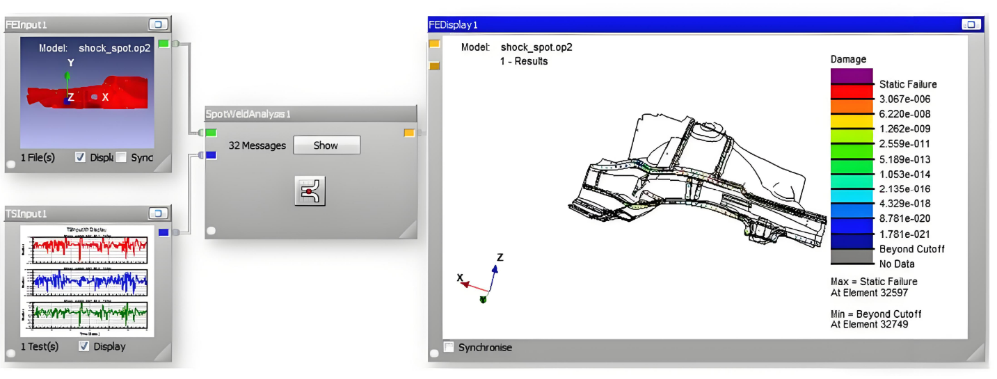 - 完成分析后,打开 结果查看器(Result Viewer),选择要展示和导出的分析结果。nCode 支持多种形式的结果展示,包括疲劳寿命分布、损伤累积、应力应变分布、频率响应等。通过选择不同的分析结果,您可以获得对应的结果图表。